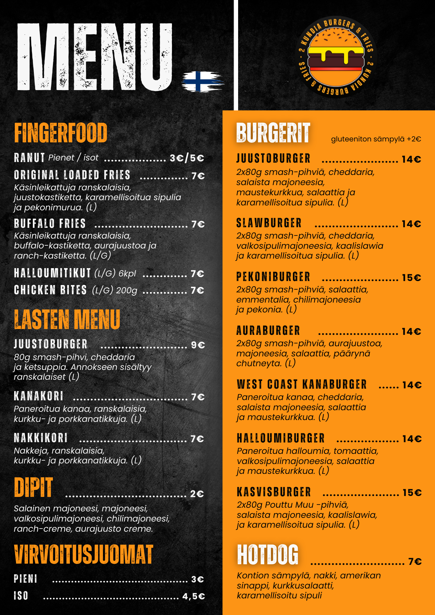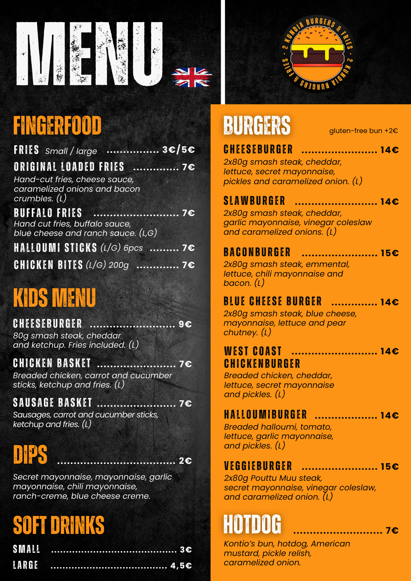 2x80g smash-pihviä, cheddaria, valkosipulimajoneesia, kaalislawia ja karamellisoitua sipulia. (L)
