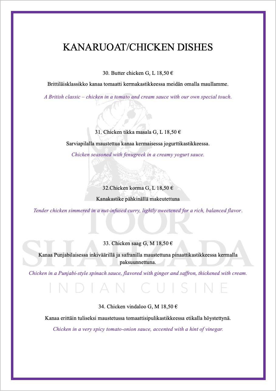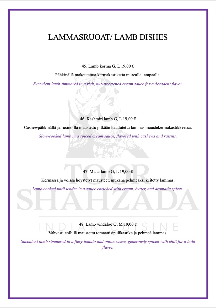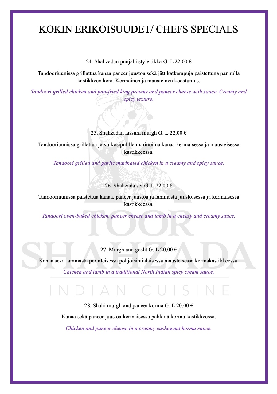 Menu from Ravintola Toor Shahzada